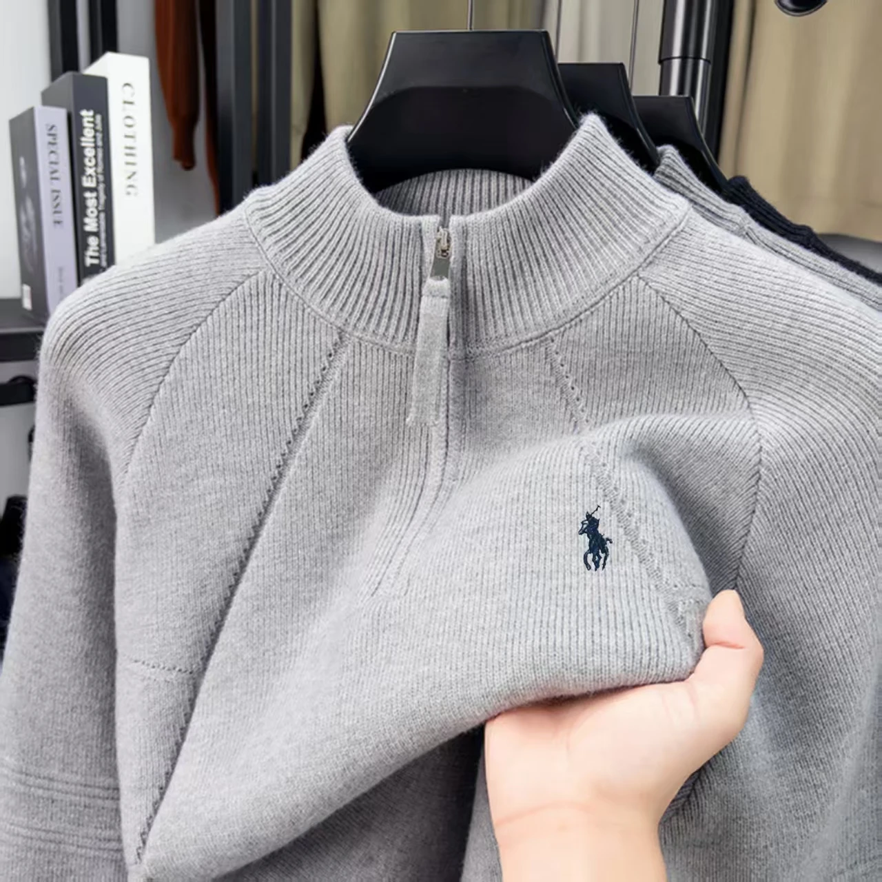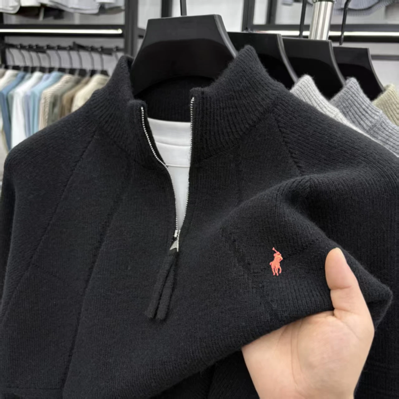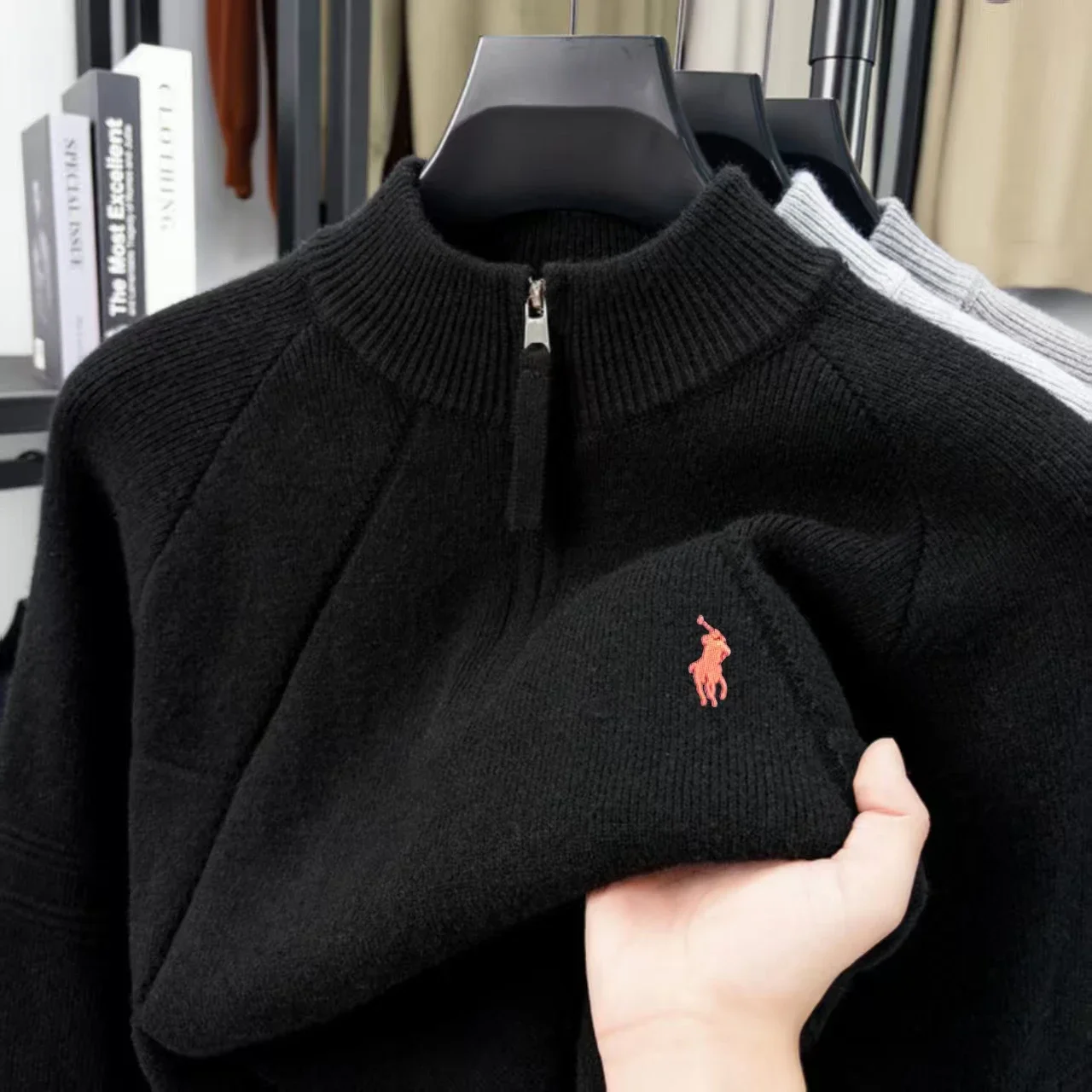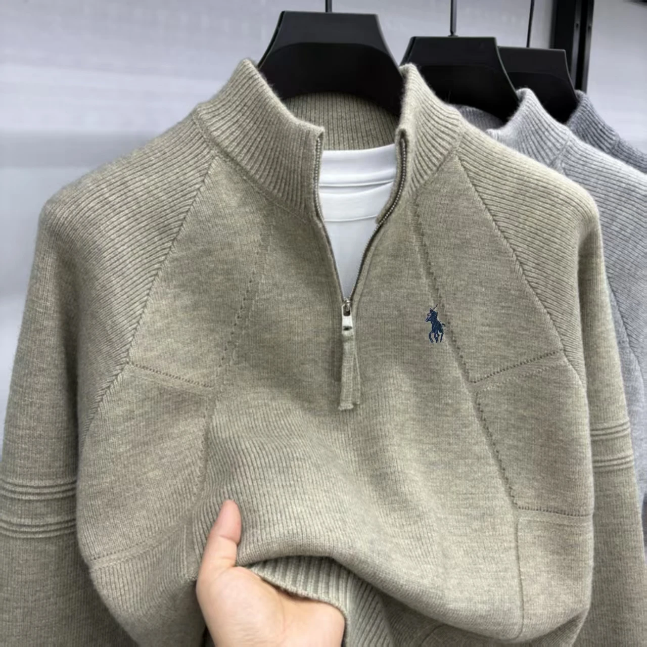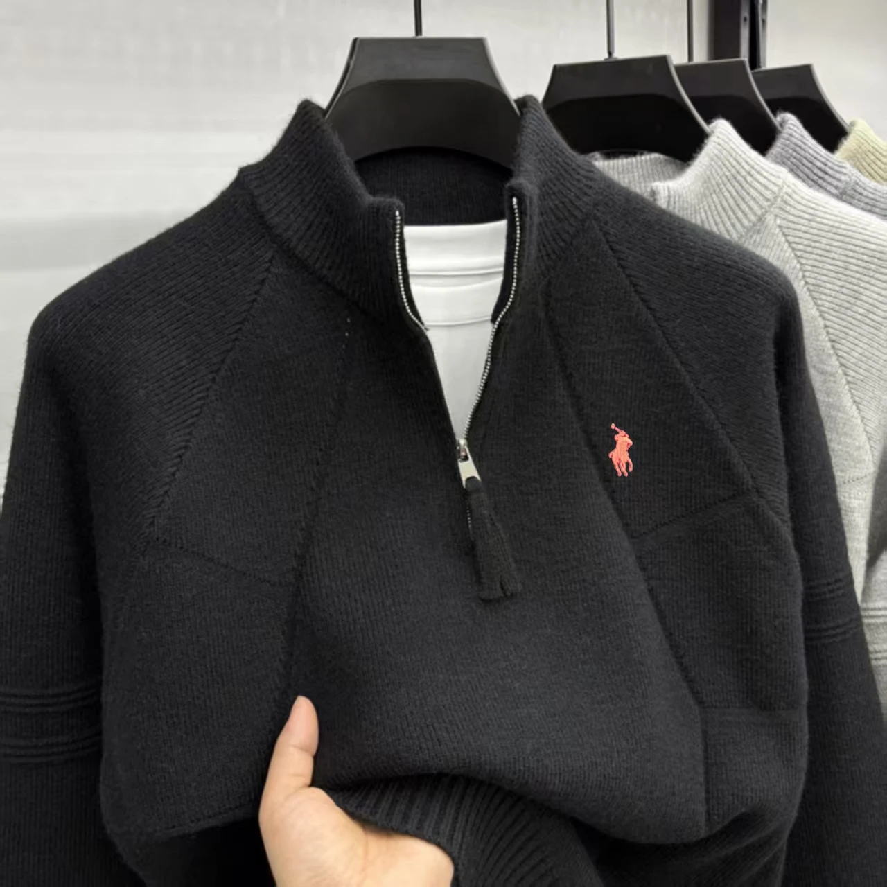 Luxury high-end embroidery half zip men's high neck sweater fried dough twists pattern wool knitting men's casual wear